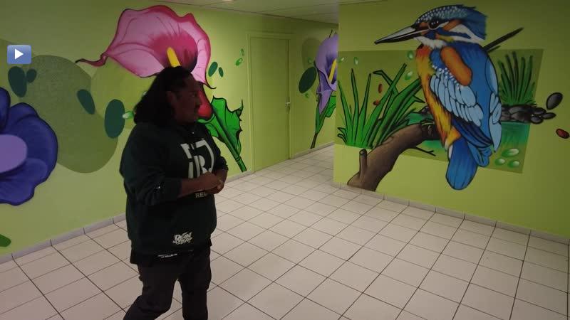Découverte de la fresque réalisée par l'artiste Dean, dans l'entrée de la résidence le Blooteland. Itv Dean, Graphiste et Artiste.