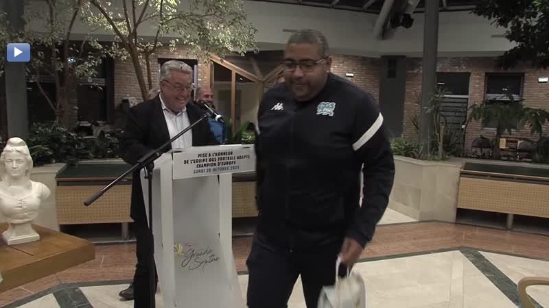Football avec l'équipe de foot adapté, Grande-Synthe championne d'Europe. Itv Mohamed-Ali Yahiaoui, Capitaine - Arezki Fatis, Président de l'OGS Football - Pierre Lozano, Référent catégorie adapté OGS Football.