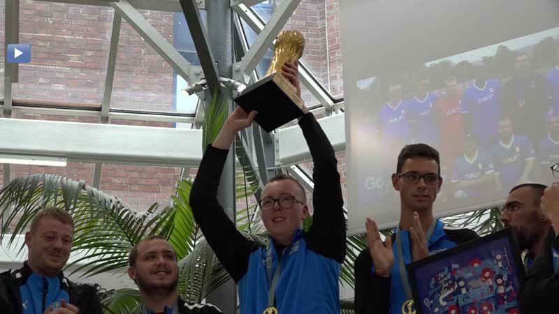 Suite à sa victoire à la Gothia Cup, l'équipe de foot inclusive de l'OGS a été conviée par le maire de Grande-Synthe au sein même de la maison communale afin de l'honorer. Itv Martial Beyaert, Maire de Grande-Synthe - Pierre Lozano, Entraineur principal - Alain Planckeel, Défenseur - Mohammed Yahiaoui, Capitaine et attaquant.